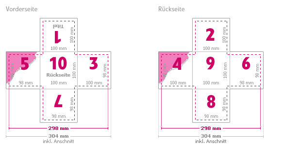 Format: offen: 298 mm x 298 mm; geschlossen: 100 mm x 100 mm